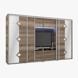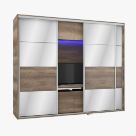 Diamond tolóajtós Tv-s gardrób 239 cm és 318 cm-es méretekben. Egyediségét az adja, hogy zárt állapotban egy elegáns tolóajtós gardróbnak tűnik,viszont a középső részen a televízió számára kialakított hely található. Kiegészíthető még RGB LED világítással. Opcionálisan választható termékek: -sarokpolc - tolóajtós sarokelem (alsó illetve felső magas..