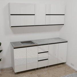 Magasfényű Gerda konyhablokkunk visszafogott, valamint merész színkombinációkban ideális választás otthonodba. Praktikus elrendezés, jól kihasználhatóság jellemzi. Elemeire bontva, készre szerelten szállítjuk és csak a lábait kell felrögzíteni. A bútorelemek sorrendje szabadon variálható.A korpusz 18 mm laminált forgácslap fehér színben, ABS élfóli..