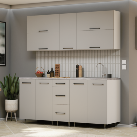Modern felnyíló ajtós megoldással, praktikus fiókos elemmel rendelkező komplett konyhabútor. Az elemes konyhabútornak köszönhetően bármely elrendezésben megvalósíthatod és berendezheted konyhádat, hiszen elemeire bontva készre szerelten szállítjuk és csak a lábait, illetve fogantyúit kell utólag felrögzíteni.A korpusz 18 mm laminált forgácslap, ABS..