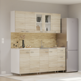 A korpusz 18 mm laminált forgácslap, ABS élfóliával zárva. A hátfal HDF lemez tűzőkapoccsal rögzítve. Az ajtó-, fiókfront laminált forgácslap ABS élfóliával ellátva, a polcok alátámasztásai fém polctartóval vannak ellátva. A fiókok teljes kihúzású fióksínnel vannak ellátva. A munkalap 38 mm, mérsékelten hő- és vízálló. Mosogatótálca ( két medencés ) rozsdamentes, szifonnal, lefolyóval. A falrögzítő szerelvény nem tartozék, a biztonságos rögzítés érdekében javasoljuk kérje ki szakember véleményét.